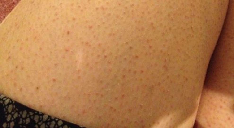 Фолликулит имеет симптомы, похожие на угревую сыпь, с небольшими бугорками на коже пораженного участка.