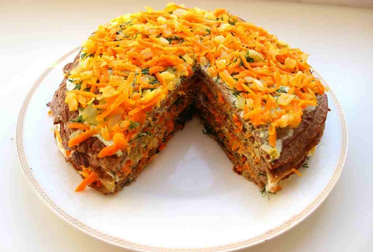 Привычная майонезная заправка и пассерованные овощи дополняются огурцом, который делает вкус закусочного торта свежим и более нежным.