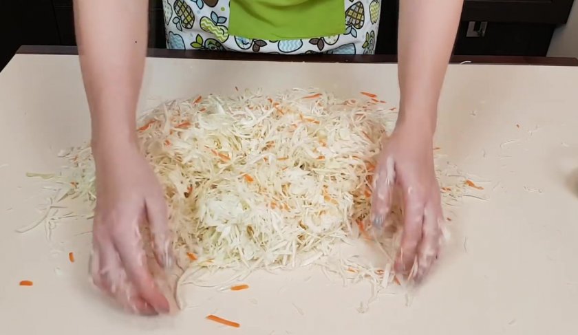 Подготовленную нашинкованную капусту с натёртой морковью тщательно обмять руками, чтобы она пустила собственный сок. Не добавляйте много моркови в блюдо, иначе капуста не будет хрустеть.